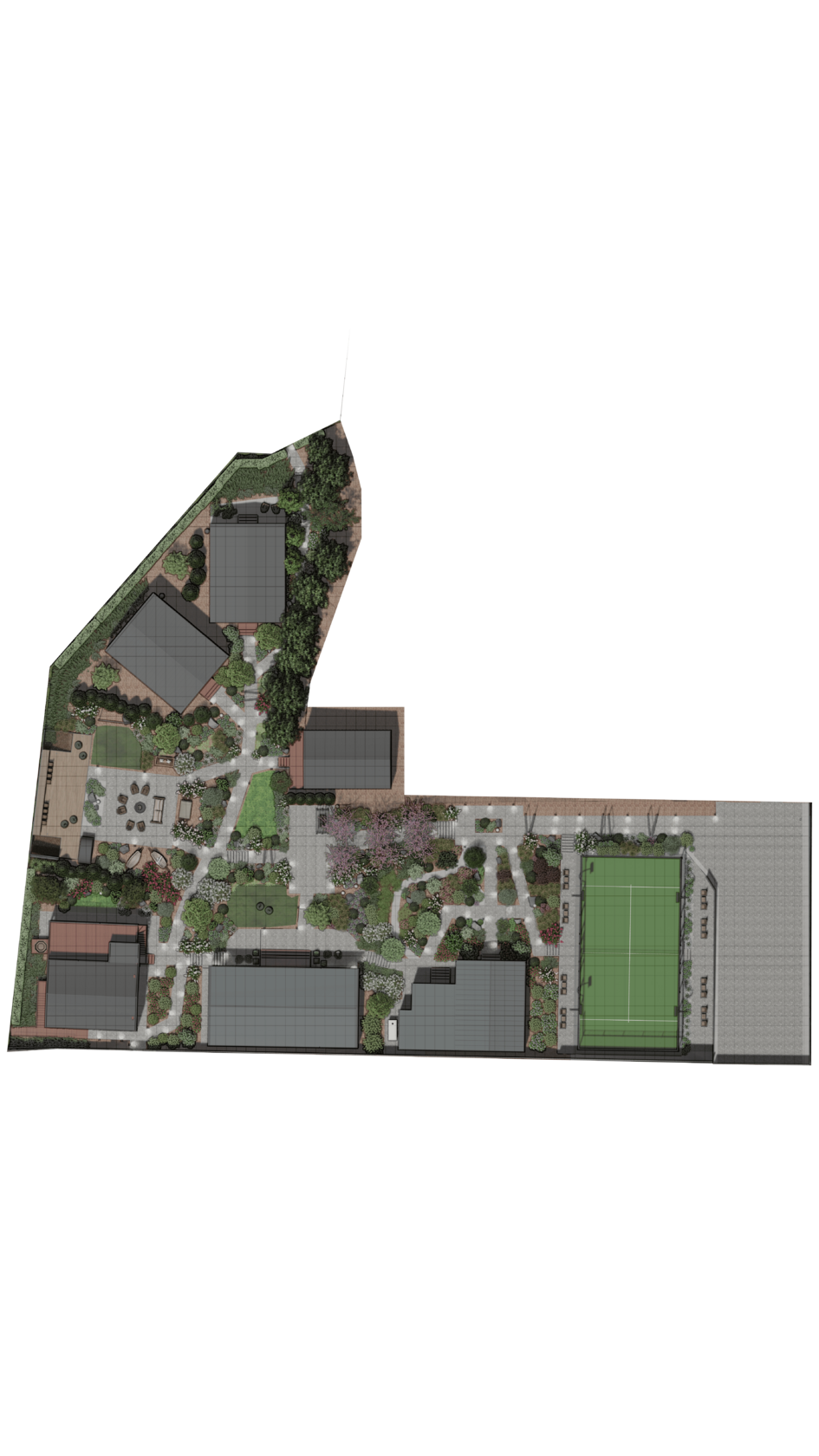 Это большой гостиничный комплекс из барнхаусов, который находится рядом с водоемом. На территории есть общественные места отдыха: падел-теннис, а также общая зона очага, уличный кинотеатр, качели, гамаки и сетка-лежак. Все места отдыха спроектированы таким образом, чтобы человек находился в единении с природой. Также у каждого домика есть свои отдельные места для отдыха.